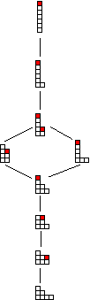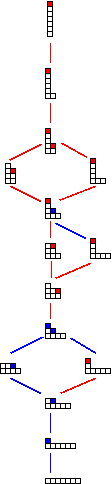 Dessinons sur une ligne le seul profil possible avec un grain. Puis, sur la ligne au-dessous, dessinons les profils possibles obtenus à partir de celui-là en ajoutant un grain. Et continuons ainsi : sur chaque ligne, on dessine les profils obtenus en ajoutant un grain sur une colonne d'un profil de la ligne du dessus. Puis, comme montré sur la figure 4, relions deux profils si l'un est obtenu à partir de l'autre en ajoutant un grain. On obtient un diagramme dans lequel chaque ligne ne contient que des profils contenant le même nombre de grains. Plus précisément, la n-ième ligne contient des profils avec n grains. Voir figure 4.